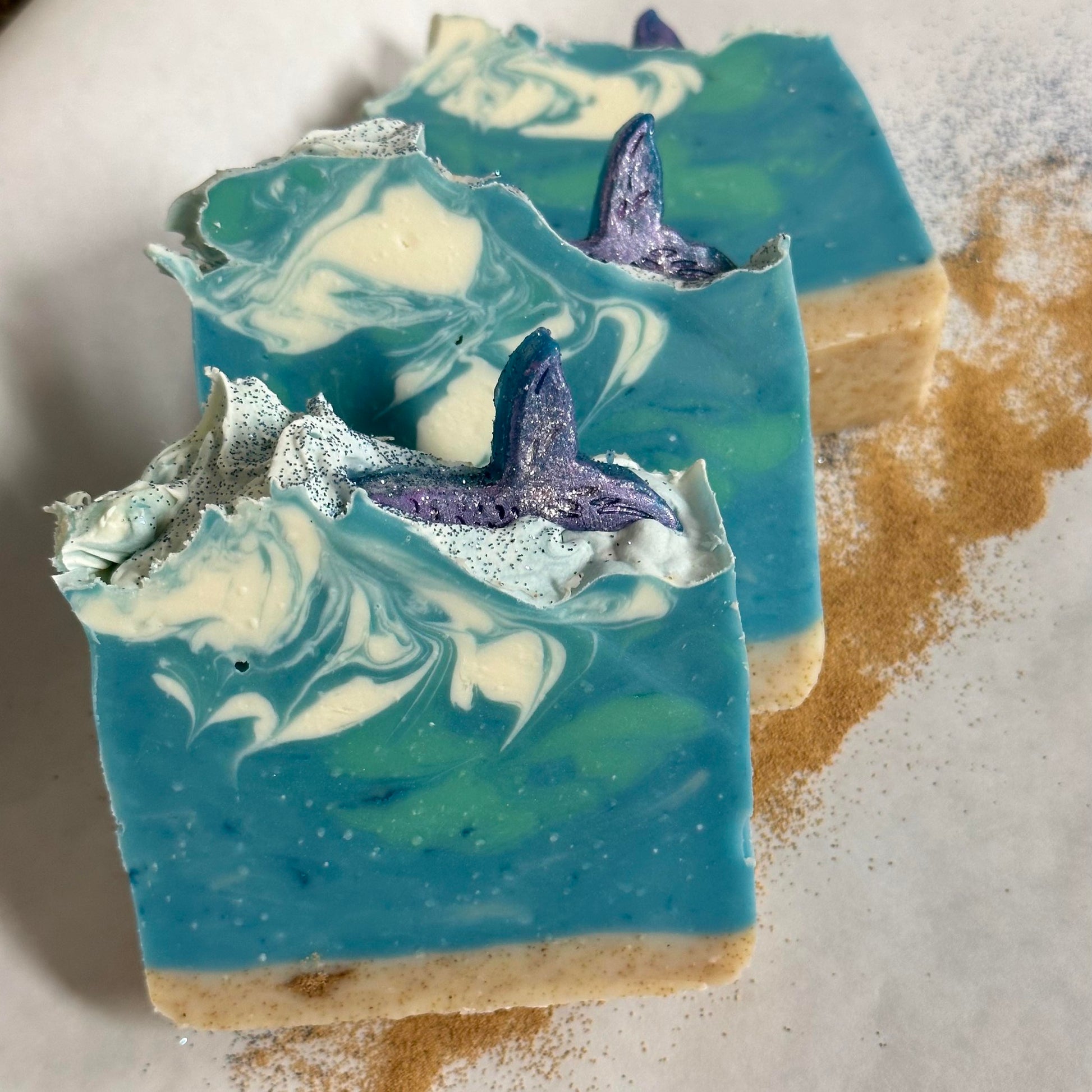 Mermaid Lagoon cold process soap. A delight to the senses! A beautiful seascape with mermaid tail peeking out of the waves at the top with a sprinkle of blue glitter to top it off and add a touch of whimsy.